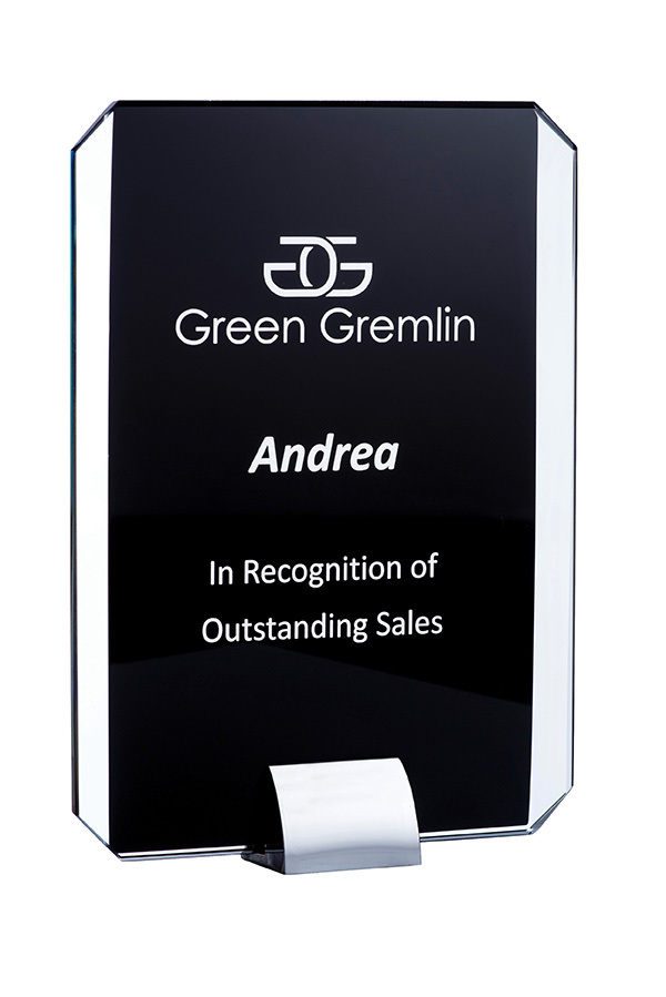 A simple glass award with a bold colour background, presented on a metal stand.