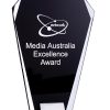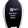 A simple glass award with a bold colour background, presented on a metal stand.