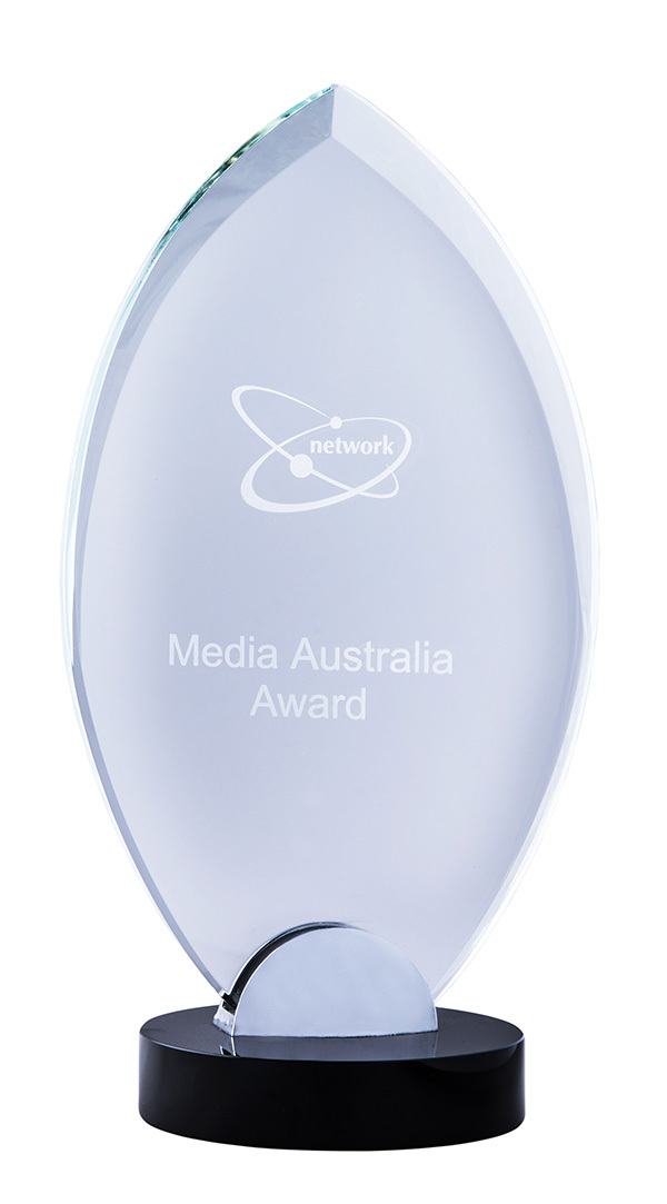 A premium glass award with a black and silver stand