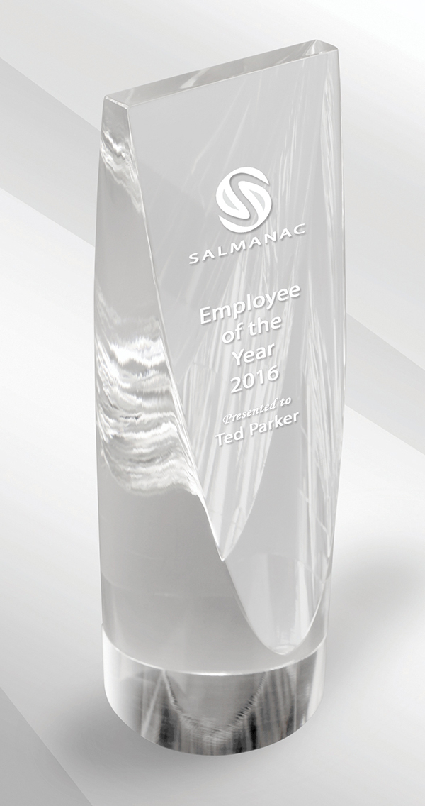 A heavy clear crystal award in a unique shape!