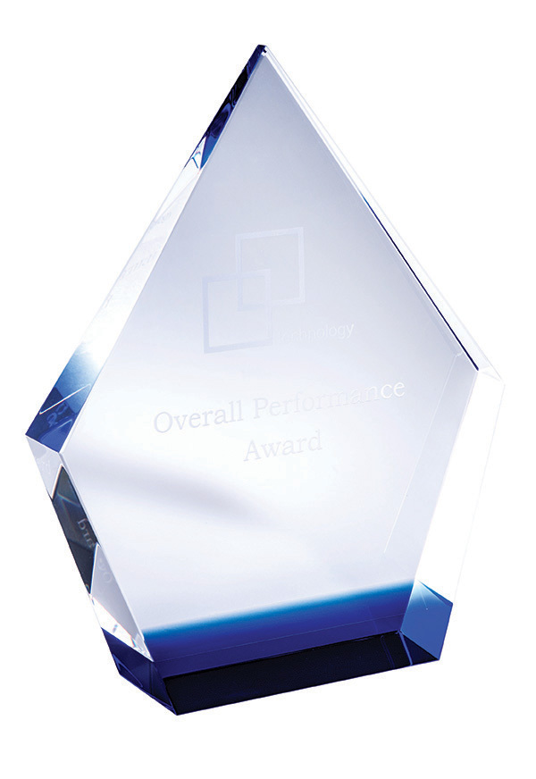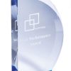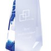 A clear crystal award with a vivid blue stripe at the bottom